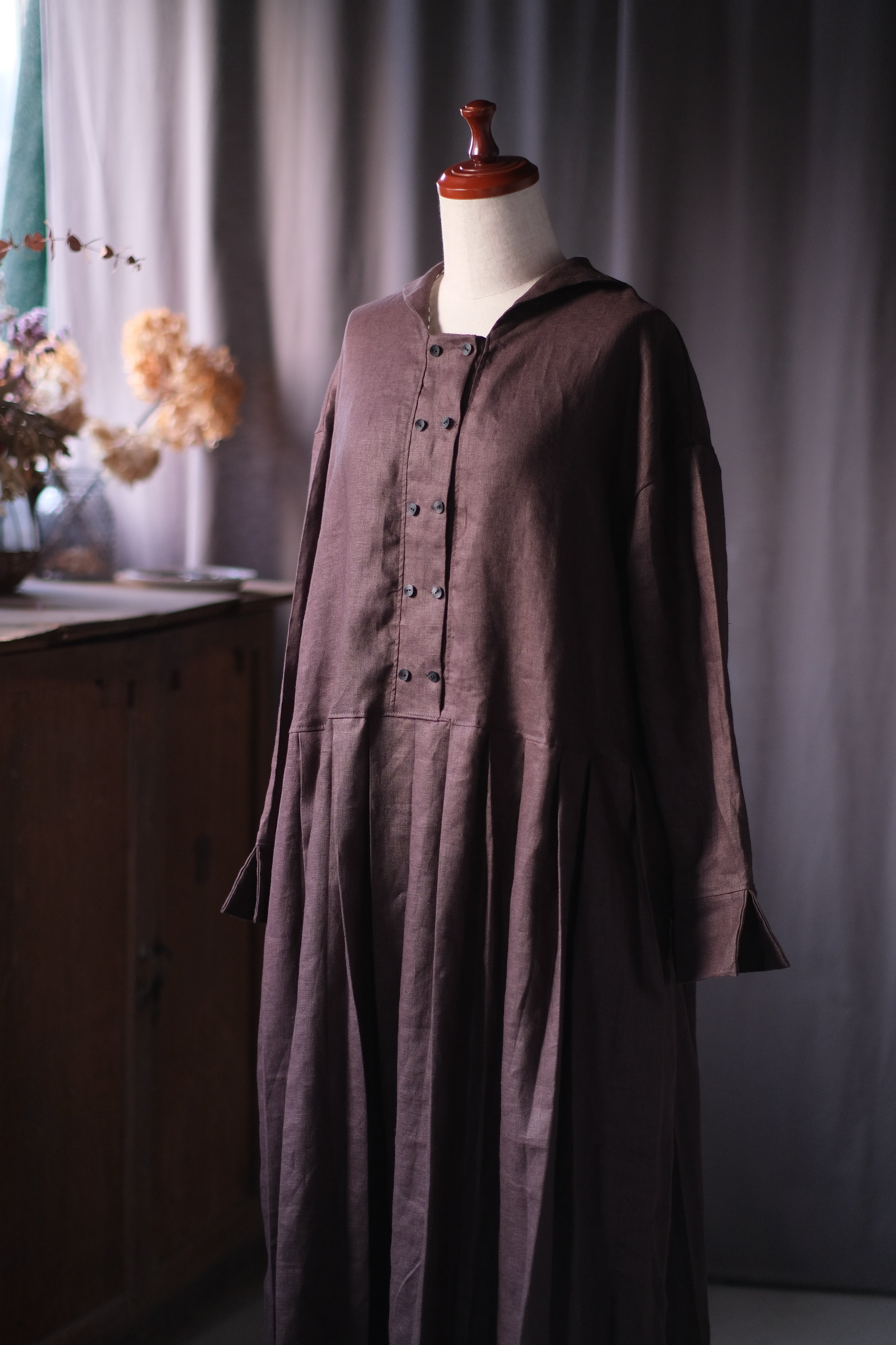 素材には少し艶リネン生地を使用しております。落ち着いたチャコールカラーで、どんなシーンにも合わせやすい一着です。