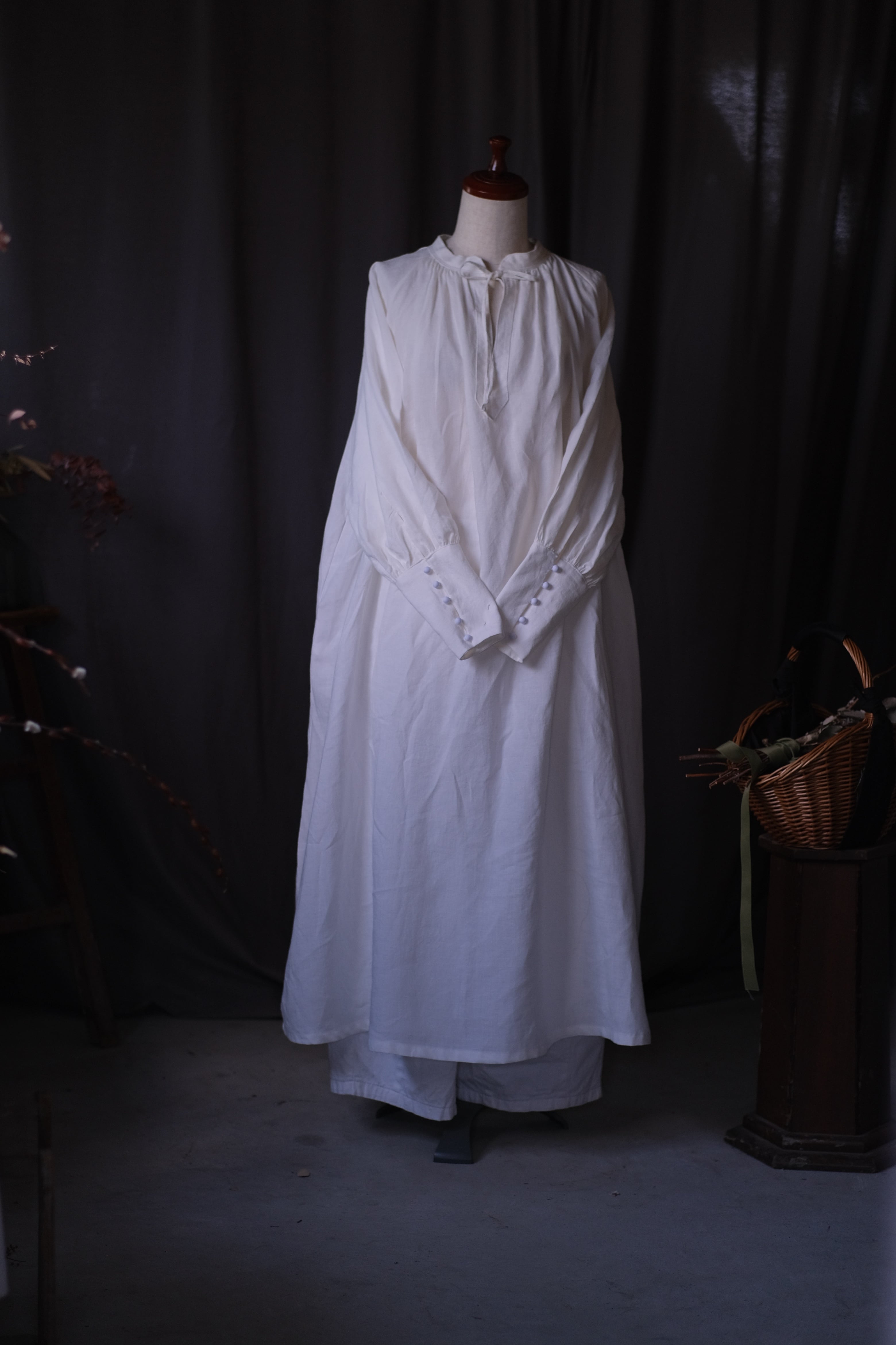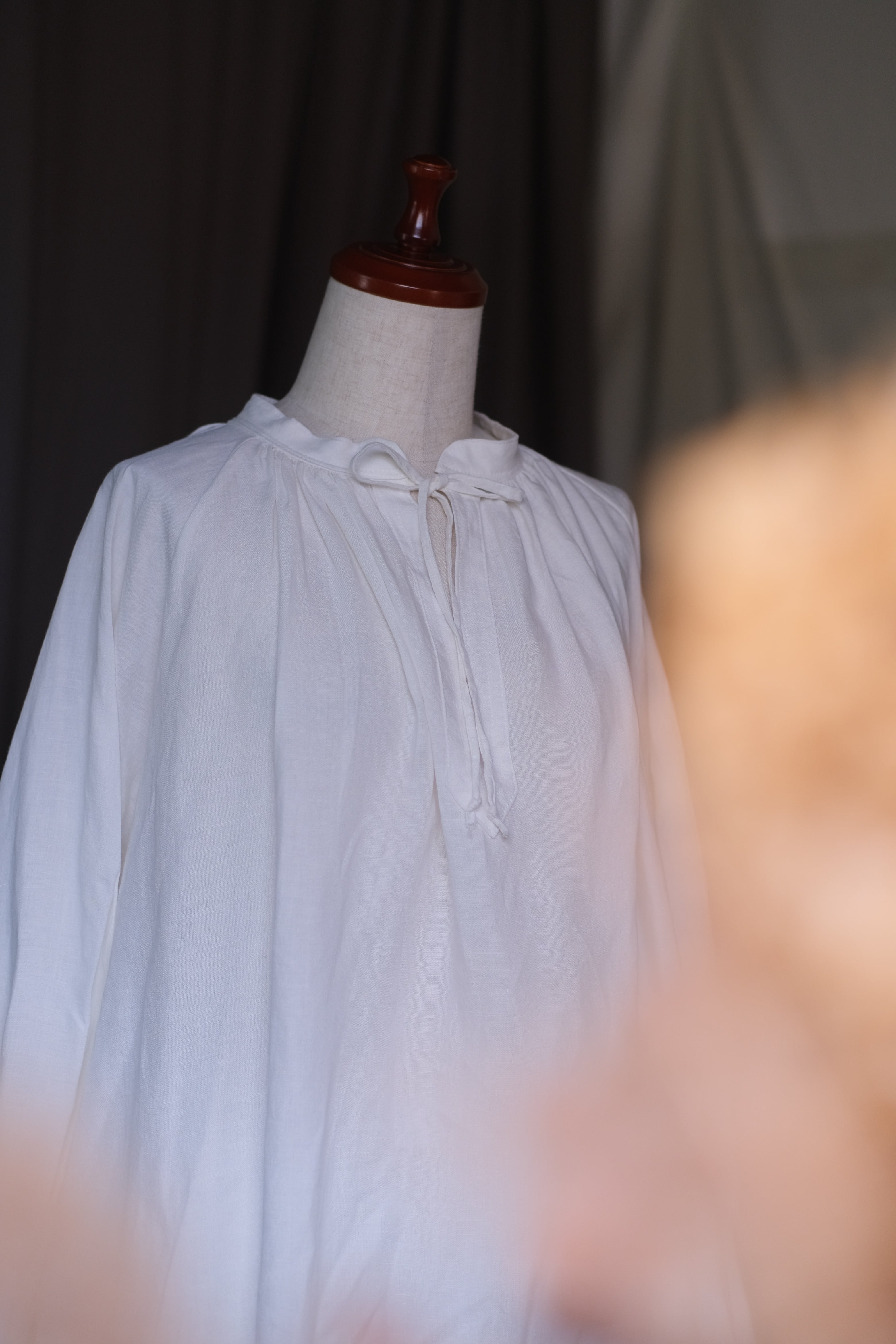 素材には軽やかで通気性の良いリネン生地を使用しております。清楚感のある白色は、どんなスタイルにも合わせやすい一着です。